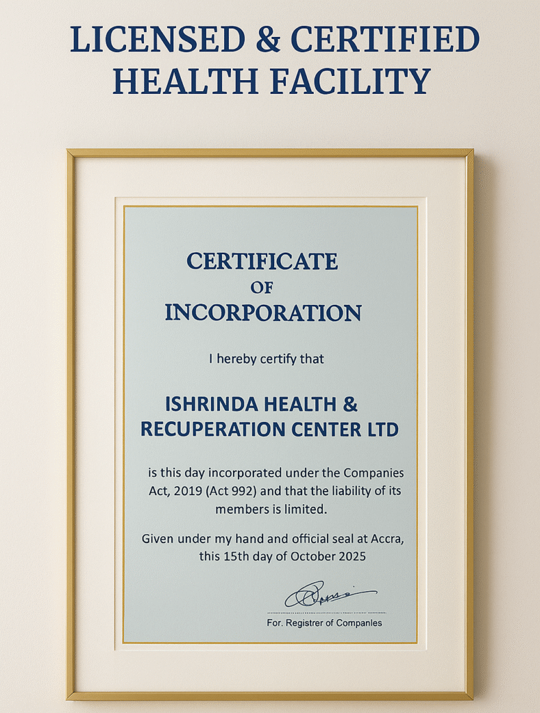 Ishrinda Health & Recuperation Center is a fully registered and licensed healthcare agency, operating under the professional standards set by Ghana’s health regulatory authorities.